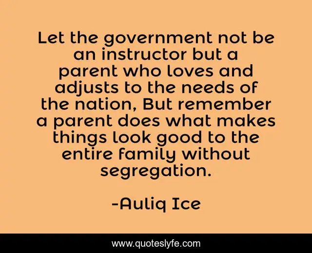 This page presents the quote "Let the government not be an instructor but a parent who loves and adjusts to the needs of the nation, But remember a parent does what makes things look good to the entire family without segregation.". Author of this quote is Auliq Ice. This quote is about developing, examplary, leadership-development, developing-leadership-skills, politicians, political-philosophy, example-for-change,.
