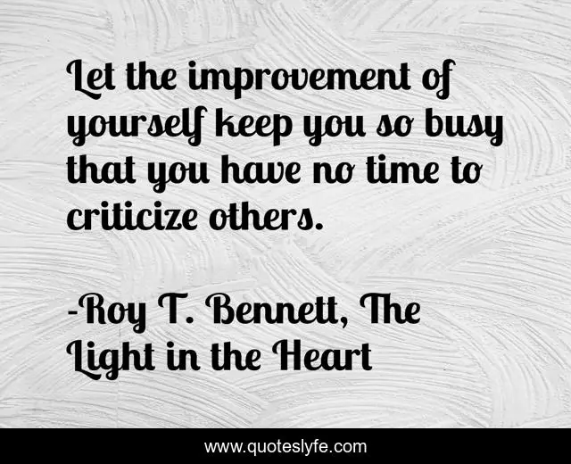 This page presents the quote "Let the improvement of yourself keep you so busy that you have no time to criticize others.". Author of this quote is Roy T. Bennett, The Light in the Heart. This quote is about motivation, inspire, optimistic, learning, inspirational-life, life-and-living, living, inspiring, positive,.
