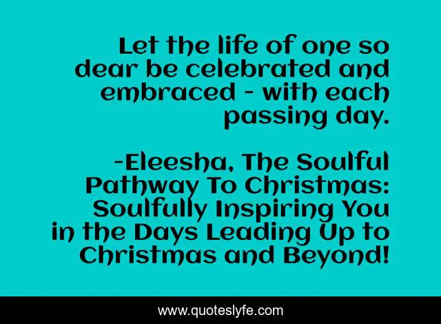 This page presents the quote "Let the life of one so dear be celebrated and embraced - with each passing day.". Author of this quote is Eleesha, The Soulful Pathway To Christmas: Soulfully Inspiring You in the Days Leading Up to Christmas and Beyond!. This quote is about christmas-spirit, positive, motivational, empowerment, soul, quotes, channeling, inspirational, affirmations,.