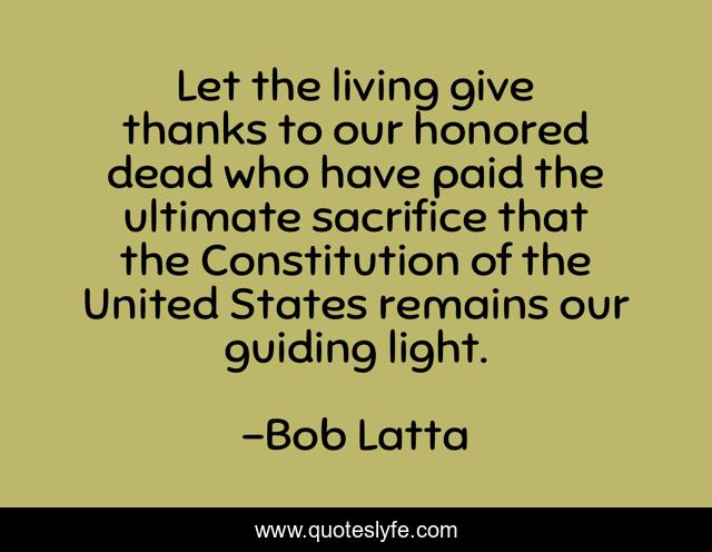 This page presents the quote "Let the living give thanks to our honored dead who have paid the ultimate sacrifice that the Constitution of the United States remains our guiding light.". Author of this quote is Bob Latta. This quote is about light, sacrifice,.