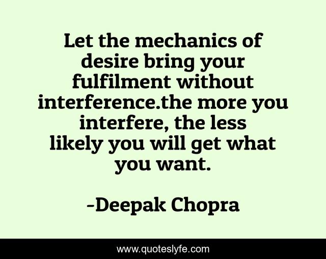 This page presents the quote "Let the mechanics of desire bring your fulfilment without interference.the more you interfere, the less likely you will get what you want.". Author of this quote is Deepak Chopra. This quote is about desire, life, love, fulfilment, intention, karma, affection,.