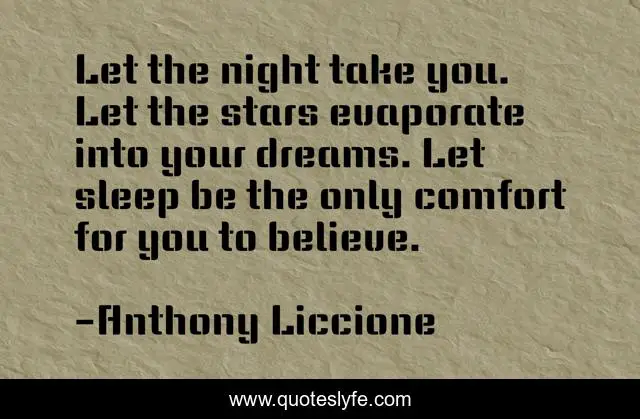 This page presents the quote "Let the night take you. Let the stars evaporate into your dreams. Let sleep be the only comfort for you to believe.". Author of this quote is Anthony Liccione. This quote is about secluded, soothing, sleep, escape, tranquil, still, sweep-away, undisturbed, comfort,.
