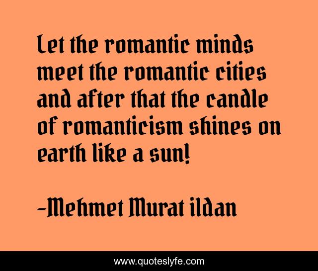 This page presents the quote "Let the romantic minds meet the romantic cities and after that the candle of romanticism shines on earth like a sun!". Author of this quote is Mehmet Murat ildan. This quote is about city, ildan-words, mehmet-murat-ildan, ildan-wise-sayings, romantic-minds, ildan-wisdom, turkish, turkish-playwrights, romanticism,.