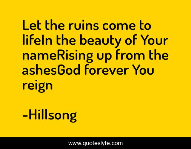 This page presents the quote "Let the ruins come to lifeIn the beauty of Your nameRising up from the ashesGod forever You reign". Author of this quote is Hillsong. This quote is about life, love, god, cross, jesus, hope, inspirational, enthusiasm, grace,.