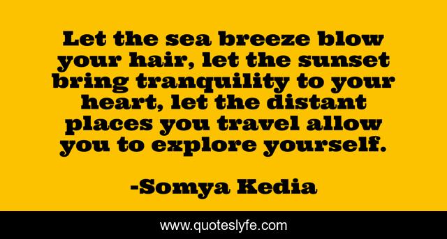 This page presents the quote "Let the sea breeze blow your hair, let the sunset bring tranquility to your heart, let the distant places you travel allow you to explore yourself.". Author of this quote is Somya Kedia. This quote is about tranquility, travel, yourself, explore, sunset, sea,.