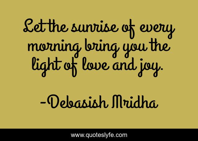 This page presents the quote "Let the sunrise of every morning bring you the light of love and joy.". Author of this quote is Debasish Mridha. This quote is about love, philosophy, debasish-mridha, debasish-mridha-m-d, quotes, sunrise, inspirational, enthusiasm, love-and-joy,.