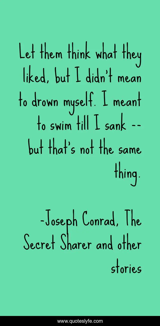 This page presents the quote "Let them think what they liked, but I didn't mean to drown myself. I meant to swim till I sank -- but that's not the same thing.". Author of this quote is Joseph Conrad, The Secret Sharer and other stories. This quote is about suicide, despair,.