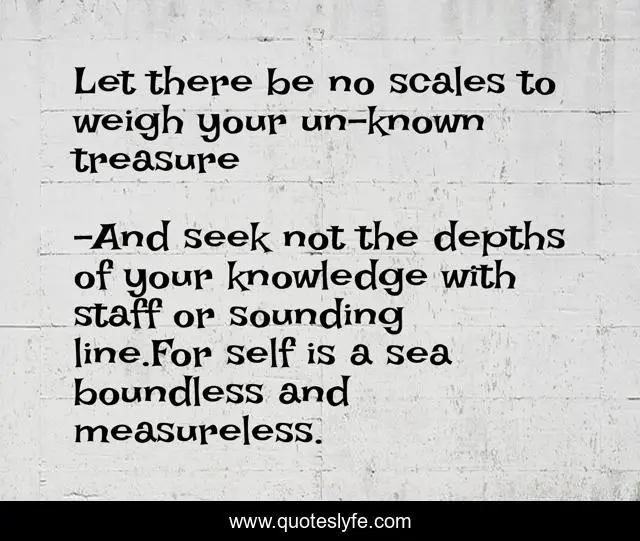 "And seek not the depths of your knowledge with staff or sounding line.For self is a sea boundless and measureless. Quotes." Quoteslyfe.com, 2025. Sat. 06 Dec. 2025. <https://www.quoteslyfe.com/quote/Let-there-be-no-scales-to-weigh-90424>.
