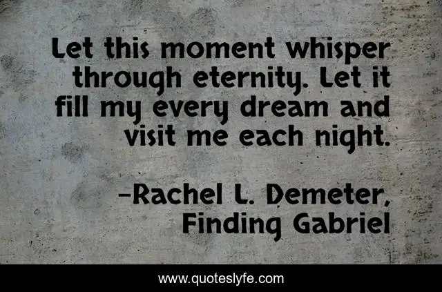 This page presents the quote "Let this moment whisper through eternity. Let it fill my every dream and visit me each night.". Author of this quote is Rachel L. Demeter, Finding Gabriel. This quote is about ariah, eternity, historical-romance, gabriel, romance, finding-gabriel, historical, dreams,.