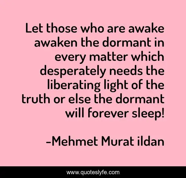 This page presents the quote "Let those who are awake awaken the dormant in every matter which desperately needs the liberating light of the truth or else the dormant will forever sleep!". Author of this quote is Mehmet Murat ildan. This quote is about mehmet-murat-ildan, turkish-playwrights, turkish-wisdom-words, awakening, sleep, turkish-aphorisms, awaken, turkish, turkish-sayings,.