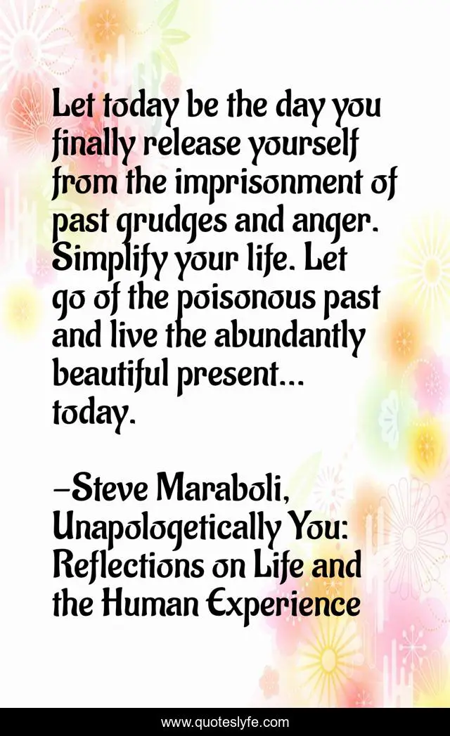 This page presents the quote "Let today be the day you finally release yourself from the imprisonment of past grudges and anger. Simplify your life. Let go of the poisonous past and live the abundantly beautiful present... today.". Author of this quote is Steve Maraboli, Unapologetically You: Reflections on Life and the Human Experience. This quote is about life, past, simplify, anger, happiness, grudges, today,.