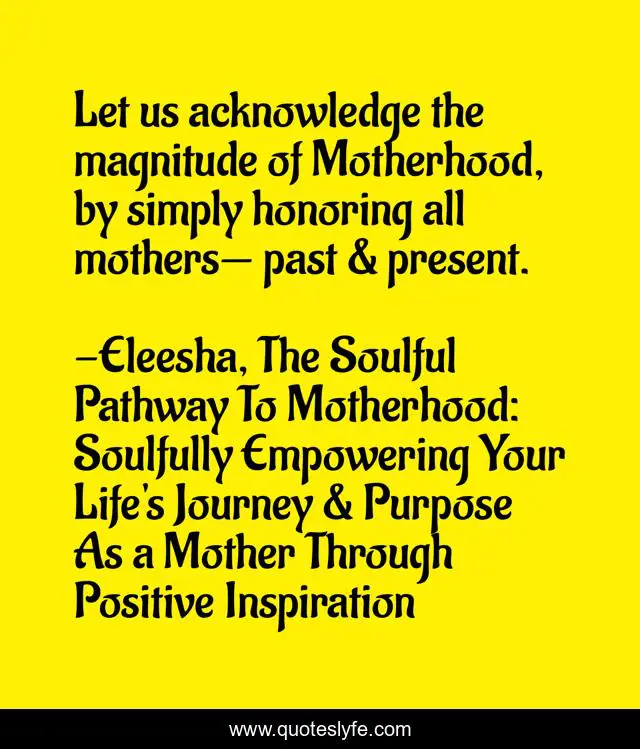 "Eleesha, The Soulful Pathway To Motherhood: Soulfully Empowering Your Life's Journey & Purpose As a Mother Through Positive Inspiration Quotes." Quoteslyfe.com, 2025. Sun. 07 Dec. 2025. <https://www.quoteslyfe.com/quote/Let-us-acknowledge-the-magnitude-of-Motherhood-205087>.