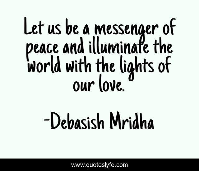This page presents the quote "Let us be a messenger of peace and illuminate the world with the lights of our love.". Author of this quote is Debasish Mridha. This quote is about life, debasish, illuminate, love, light, peace, philosophy, messenger, mridha,.