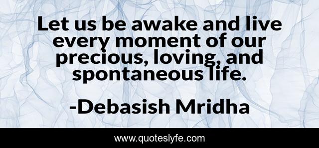 This page presents the quote "Let us be awake and live every moment of our precious, loving, and spontaneous life.". Author of this quote is Debasish Mridha. This quote is about life, love, knowledge, inspirational, intelligence, philosophy, wisdom, quotes, affection,.