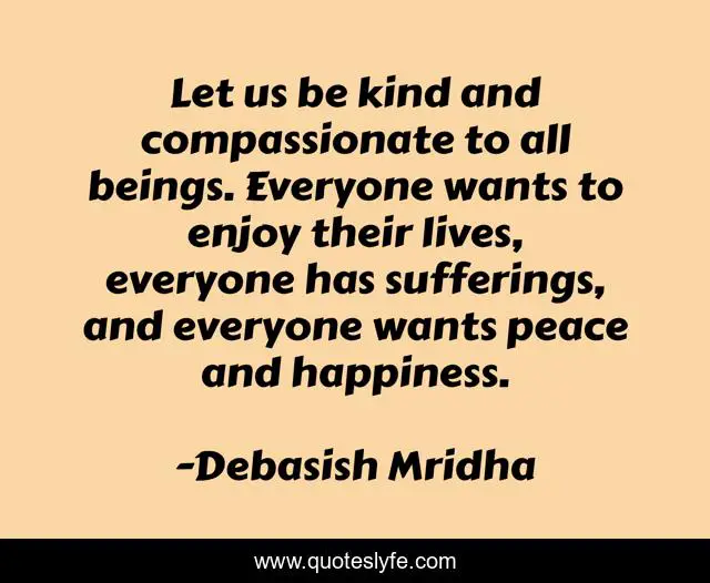 This page presents the quote "Let us be kind and compassionate to all beings. Everyone wants to enjoy their lives, everyone has sufferings, and everyone wants peace and happiness.". Author of this quote is Debasish Mridha. This quote is about peace, enjoy-life, kind-and-compassionate, philosophy, debasish-mridha, quotes, inspirational, everyone-suffers, enthusiasm,.