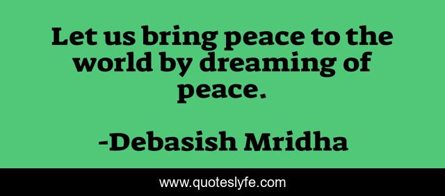 This page presents the quote "Let us bring peace to the world by dreaming of peace.". Author of this quote is Debasish Mridha. This quote is about peace, philosophy, debasish-mridha, peace-in-the-world, quotes, dreaming-of-peace, inspirational, enthusiasm, debasish-mridha-m-d,.