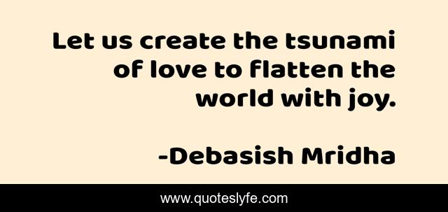 This page presents the quote "Let us create the tsunami of love to flatten the world with joy.". Author of this quote is Debasish Mridha. This quote is about life, love, knowledge, inspirational, intelligence, philosophy, wisdom, quotes, affection,.