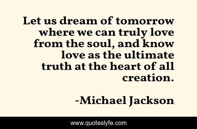 This page presents the quote "Let us dream of tomorrow where we can truly love from the soul, and know love as the ultimate truth at the heart of all creation.". Author of this quote is Michael Jackson. This quote is about enthusiasm, inspirational,.