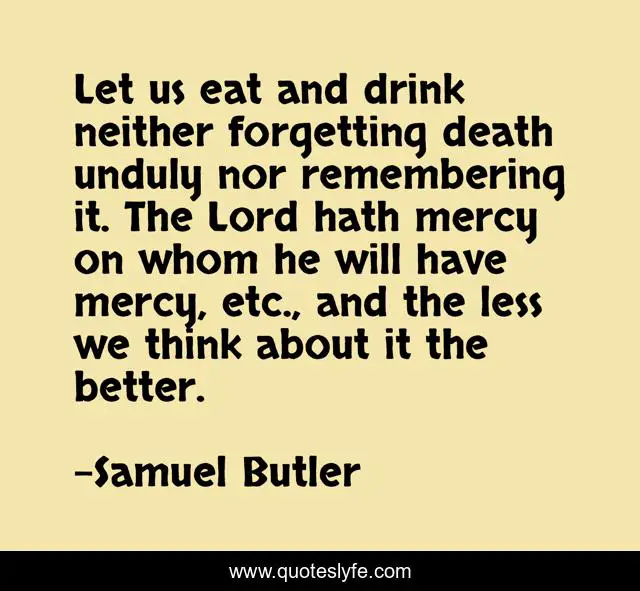 This page presents the quote "Let us eat and drink neither forgetting death unduly nor remembering it. The Lord hath mercy on whom he will have mercy, etc., and the less we think about it the better.". Author of this quote is Samuel Butler. This quote is about better, mercy, think,.