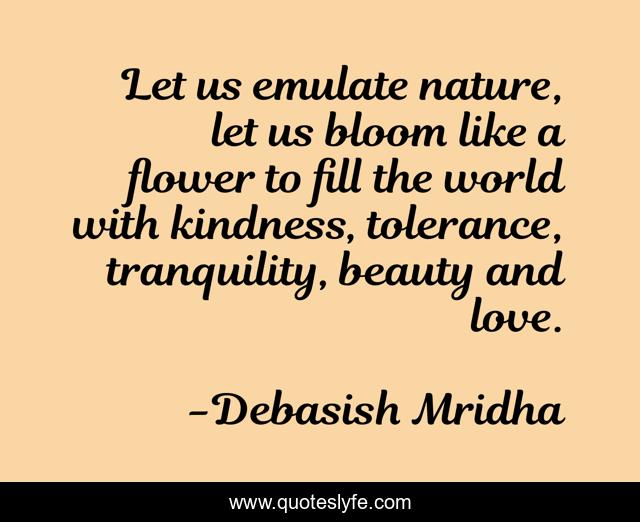 This page presents the quote "Let us emulate nature, let us bloom like a flower to fill the world with kindness, tolerance, tranquility, beauty and love.". Author of this quote is Debasish Mridha. This quote is about life, love, knowledge, inspirational, intelligence, philosophy, wisdom, quotes, affection,.