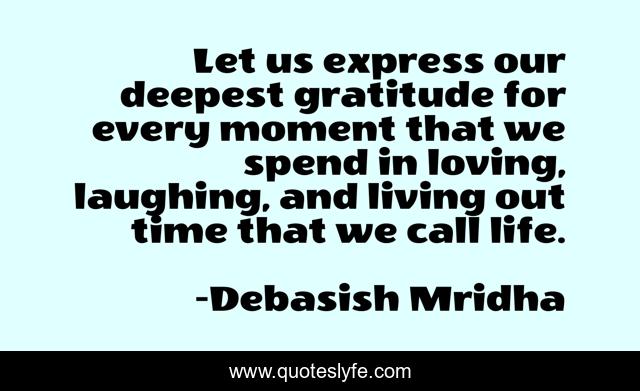 This page presents the quote "Let us express our deepest gratitude for every moment that we spend in loving, laughing, and living out time that we call life.". Author of this quote is Debasish Mridha. This quote is about life, love, knowledge, inspirational, intelligence, philosophy, wisdom, quotes, affection,.