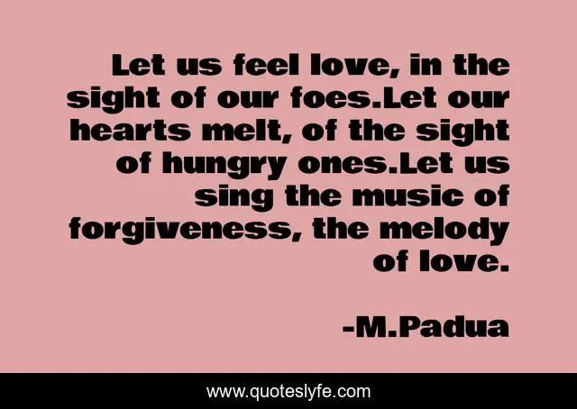 This page presents the quote "Let us feel love, in the sight of our foes.Let our hearts melt, of the sight of hungry ones.Let us sing the music of forgiveness, the melody of love.". Author of this quote is M.Padua. This quote is about peace, love, affection,.