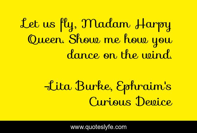 This page presents the quote "Let us fly, Madam Harpy Queen. Show me how you dance on the wind.". Author of this quote is Lita Burke, Ephraim's Curious Device. This quote is about fly, clockpunk, dance, steampunk, wizard, harpy, fantasy,.