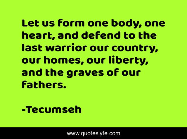 This page presents the quote "Let us form one body, one heart, and defend to the last warrior our country, our homes, our liberty, and the graves of our fathers.". Author of this quote is Tecumseh. This quote is about heart, liberty, warrior,.