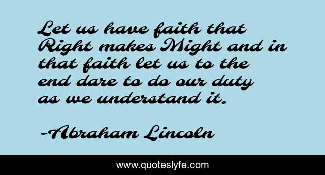 This page presents the quote "Let us have faith that Right makes Might and in that faith let us to the end dare to do our duty as we understand it.". Author of this quote is Abraham Lincoln. .
