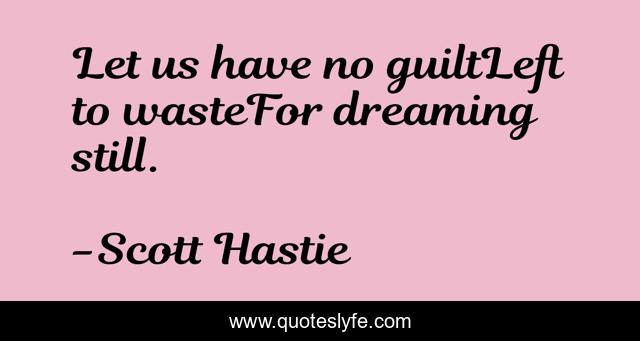 This page presents the quote "Let us have no guiltLeft to wasteFor dreaming still.". Author of this quote is Scott Hastie. This quote is about poem, still, wise, wisdom-inspirational, guilt, inspirational, dreaming, enthusiasm, waste,.