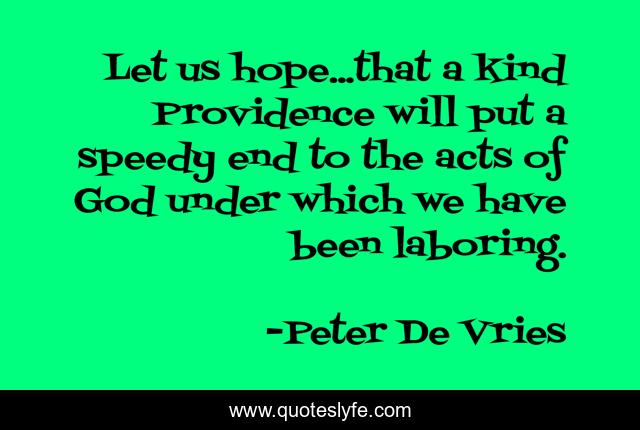 This page presents the quote "Let us hope...that a kind Providence will put a speedy end to the acts of God under which we have been laboring.". Author of this quote is Peter De Vries. This quote is about providence, end, acts-of-god, hope,.