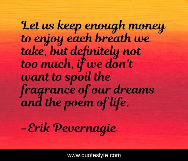 This page presents the quote "Let us keep enough money to enjoy each breath we take, but definitely not too much, if we don’t want to spoil the fragrance of our dreams and the poem of life.". Author of this quote is Erik Pevernagie. This quote is about enjoy, poem, life, fragrance, money, breath, definitely, too-much, spoil,.