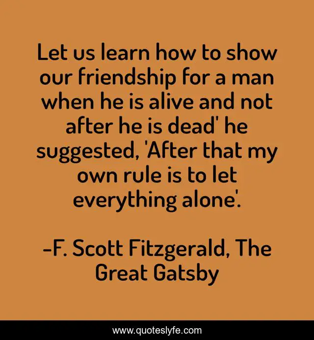 This page presents the quote "Let us learn how to show our friendship for a man when he is alive and not after he is dead' he suggested, 'After that my own rule is to let everything alone'.". Author of this quote is F. Scott Fitzgerald, The Great Gatsby. .