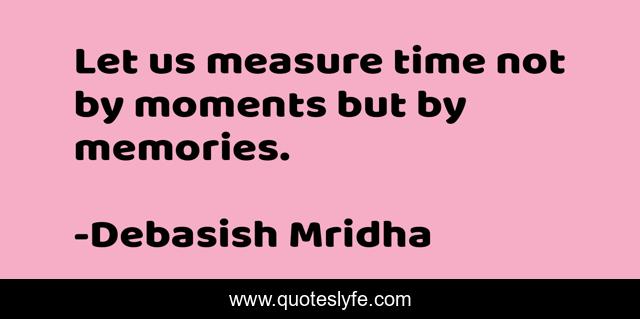 This page presents the quote "Let us measure time not by moments but by memories.". Author of this quote is Debasish Mridha. This quote is about don-t-measure-life-by-time, measure-life-by-memories, philosophy, debasish-mridha, measure-time, quotes, debasish-mridha-md, inspirational, memories,.