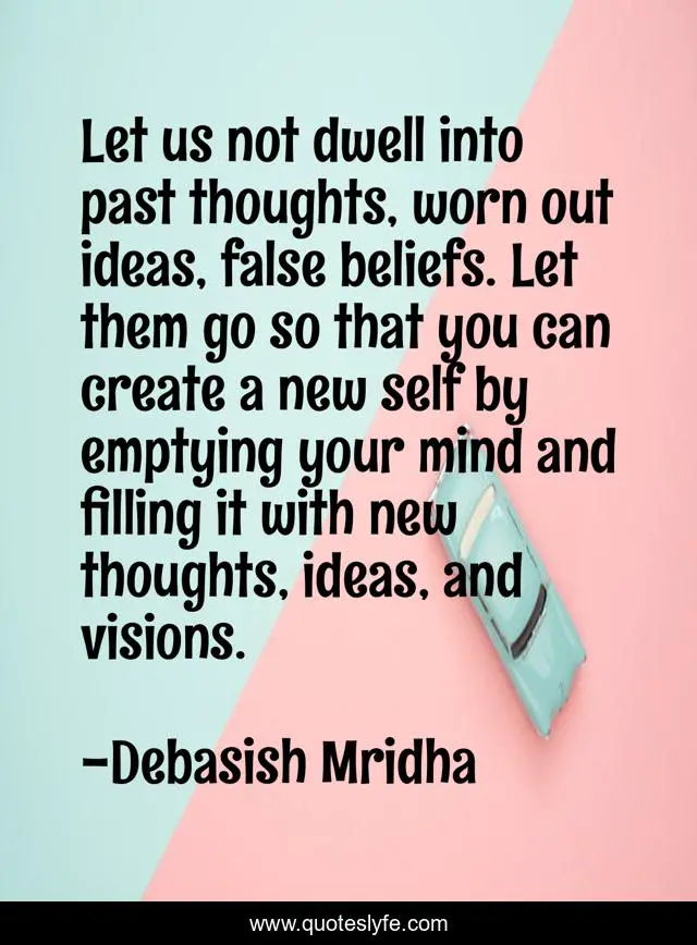 This page presents the quote "Let us not dwell into past thoughts, worn out ideas, false beliefs. Let them go so that you can create a new self by emptying your mind and filling it with new thoughts, ideas, and visions.". Author of this quote is Debasish Mridha. This quote is about miraboli, oscar-wilde, new-thoughts, past-thoughts, philosophy, debasish-mridha, ideas, quotes, gandhi,.