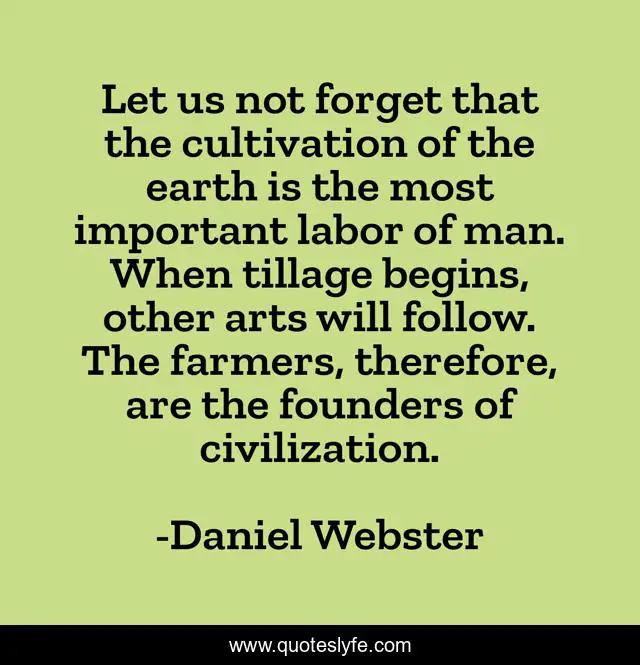This page presents the quote "Let us not forget that the cultivation of the earth is the most important labor of man. When tillage begins, other arts will follow. The farmers, therefore, are the founders of civilization.". Author of this quote is Daniel Webster. This quote is about earth, forget, man,.