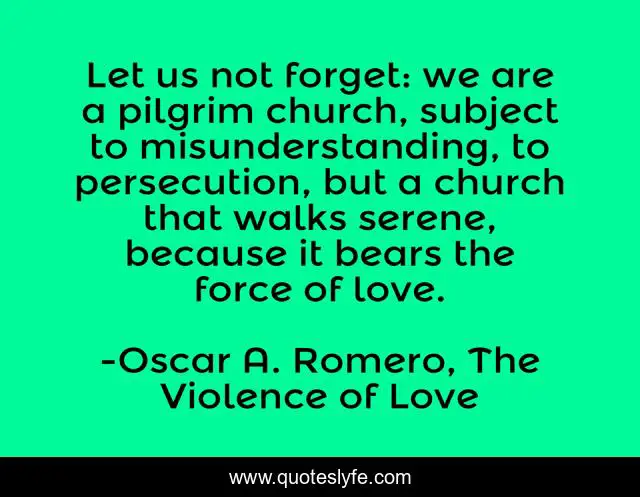 This page presents the quote "Let us not forget: we are a pilgrim church, subject to misunderstanding, to persecution, but a church that walks serene, because it bears the force of love.". Author of this quote is Oscar A. Romero, The Violence of Love. This quote is about love, pilgrim, christianity, church, persecution, affection,.