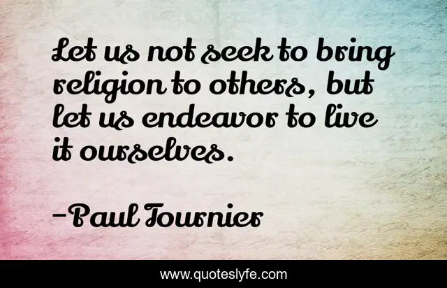 This page presents the quote "Let us not seek to bring religion to others, but let us endeavor to live it ourselves.". Author of this quote is Paul Tournier. This quote is about bring, live, endeavor,.