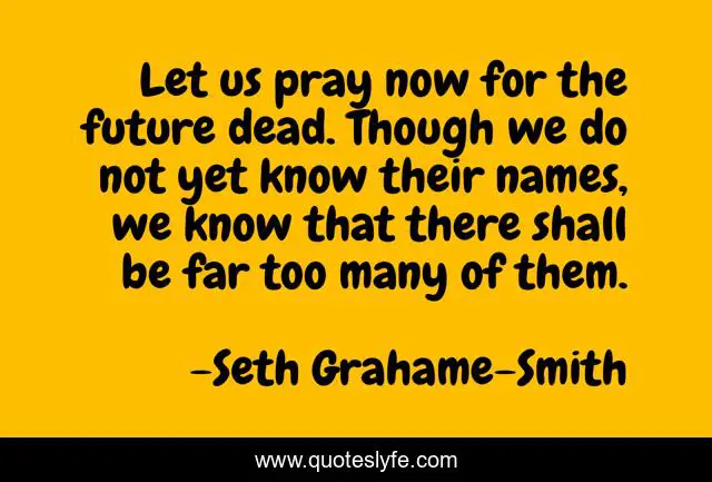 This page presents the quote "Let us pray now for the future dead. Though we do not yet know their names, we know that there shall be far too many of them.". Author of this quote is Seth Grahame-Smith. This quote is about enthusiasm, death, war, inspirational,.