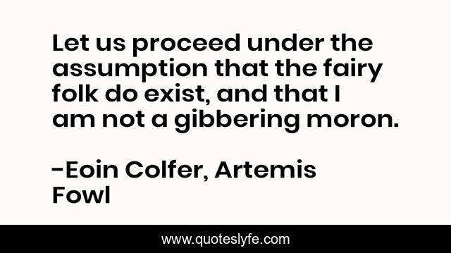 This page presents the quote "Let us proceed under the assumption that the fairy folk do exist, and that I am not a gibbering moron.". Author of this quote is Eoin Colfer, Artemis Fowl. This quote is about moron, existence, fairy,.