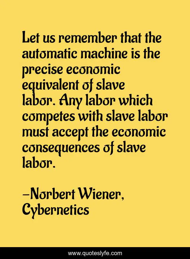 This page presents the quote "Let us remember that the automatic machine is the precise economic equivalent of slave labor. Any labor which competes with slave labor must accept the economic consequences of slave labor.". Author of this quote is Norbert Wiener, Cybernetics. This quote is about computers, cybernetics, slavery, economics, robots,.