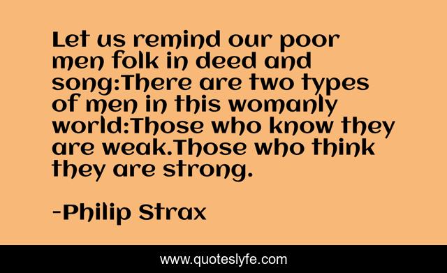 This page presents the quote "Let us remind our poor men folk in deed and song:There are two types of men in this womanly world:Those who know they are weak.Those who think they are strong.". Author of this quote is Philip Strax. .