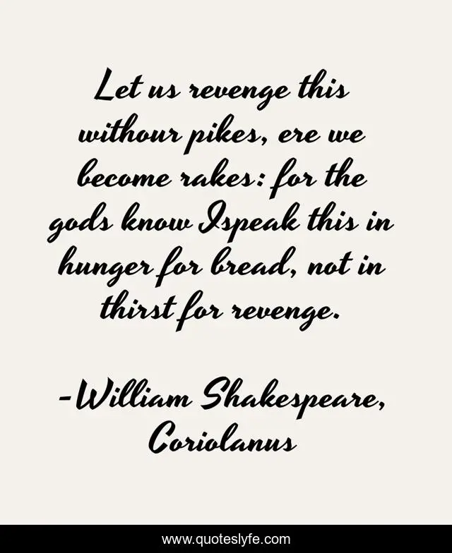 This page presents the quote "Let us revenge this withour pikes, ere we become rakes: for the gods know Ispeak this in hunger for bread, not in thirst for revenge.". Author of this quote is William Shakespeare, Coriolanus. This quote is about anger, empower, puns, revenge, shakespeare,.
