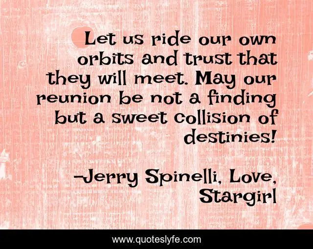 This page presents the quote "Let us ride our own orbits and trust that they will meet. May our reunion be not a finding but a sweet collision of destinies!". Author of this quote is Jerry Spinelli, Love, Stargirl. This quote is about sweet, brave, hopeful, sad,.
