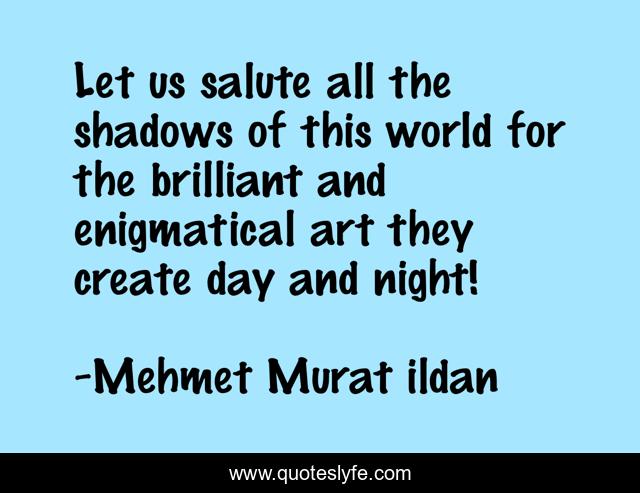 This page presents the quote "Let us salute all the shadows of this world for the brilliant and enigmatical art they create day and night!". Author of this quote is Mehmet Murat ildan. This quote is about shadows, turkish-aphorisms, art, mehmet-murat-ildan, ildan-wise-sayings, turkish, ildan-wisdom, turkish-sayings, turkish-playwrights,.