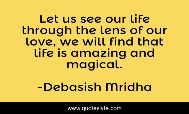 This page presents the quote "Let us see our life through the lens of our love, we will find that life is amazing and magical.". Author of this quote is Debasish Mridha. This quote is about life, debasish, love, mridha, philosophy, magical, amazing, affection,.