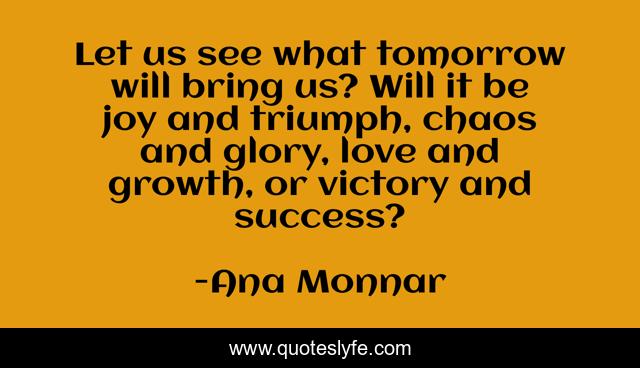 This page presents the quote "Let us see what tomorrow will bring us? Will it be joy and triumph, chaos and glory, love and growth, or victory and success?". Author of this quote is Ana Monnar. This quote is about quote, future, ana-monnar, monnar, tomorrow, quotation,.