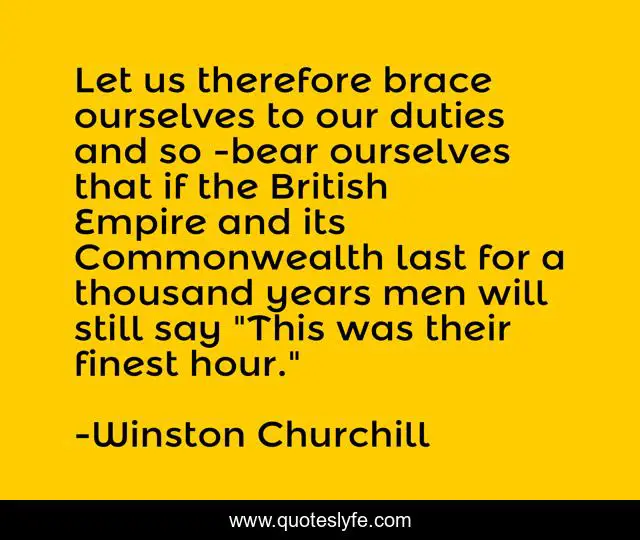 This page presents the quote "Let us therefore brace ourselves to our duties and so -bear ourselves that if the British Empire and its Commonwealth last for a thousand years men will still say "This was their finest hour."". Author of this quote is Winston Churchill. .