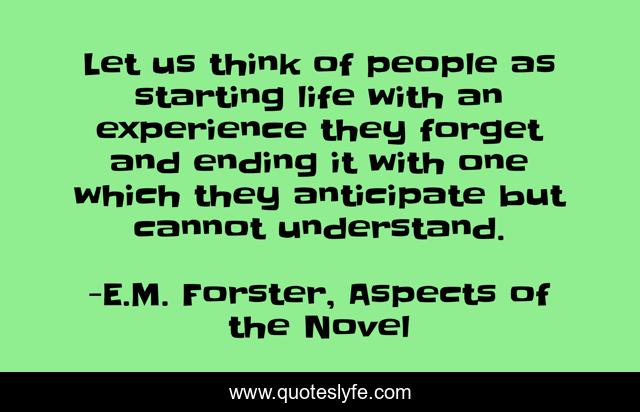 This page presents the quote "Let us think of people as starting life with an experience they forget and ending it with one which they anticipate but cannot understand.". Author of this quote is E.M. Forster, Aspects of the Novel. This quote is about life, death,.