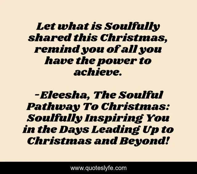 This page presents the quote "Let what is Soulfully shared this Christmas, remind you of all you have the power to achieve.". Author of this quote is Eleesha, The Soulful Pathway To Christmas: Soulfully Inspiring You in the Days Leading Up to Christmas and Beyond!. This quote is about christmas-spirit, positive, motivational, empowerment, soul, quotes, channeling, inspirational, affirmations,.